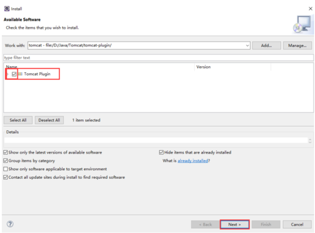 4.在列表框中选中tomcat-plugin直接点击下一步。